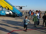 Es ist soweit. Über ein halbes Jahr haben wir auf diesen Moment gewartet. Um 19:30 holt uns das Taxi von Zuhause ab und bringt uns an den Frankfurter Flughafen. Wir dachten 3 Stunden vor Abflug sei zeitig genug, aber als wir uns dem Air Namibia Schalter näherten wurden wir freundlichst darauf hingewiesen, das zwar hier der Check-In Schalter sei, aber das Ende der Schlange doch ganz woanders - soooviele Leute waren schon da und man hat anscheinend nur auf uns gewartet, um den Schalter zu öffnen. Nun nach knapp einer Stunde durften auch wir dann die Koffer Aufgeben und hatten unsere Bordkarten in der Hand. Zwischenzeitlich kamen auch Oma und Opa überraschend vorbei. Gemeinsam sind wir noch mal zum Terminal gefahren, damit sich 'klein' Jan noch auf dem dortigen tollen Spielplatz austoben konnte. Die Handgepäck Kontrolle verlief überraschend unkompliziert, trotz daß mein Rucksack voll verkabelt war (Kamera, Ladegeräte, etc) und pünktlich um 22:00 durften wir dann ins Flugzeug. |