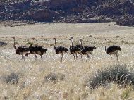 Auf der Farm werden Sträuße gezüchtet, die wir uns zunächst aus der Nähe anguckten. Dann wanderten wir weiter um ein wenig in den Bergen herum zu klettern. Das machte Spaß, sich endlich mal etwas zu bewegen. Wir schafften es fast bis oben, machten es uns dann aber auf einem Felsvorsprung bequem, um den Sonnenuntergang abzuwarten. Der Felszug verfärbte in wunderschönes Rot. Wie immer wurde es schlagartig dunkel und wir eilten zurück zum Campingplatz. Hier grillten wir unser leckeres Straußen- und Kudufleisch und kurz nach 8 Uhr holte uns Ralf zur Nachtfahrt ab. Zaida nahm auf der Rücksitzbank Platz, Jan saß mit mir vorne. Ausgestattet mit Ferngläsern ging es über Stock und Stein. Ralf kannte sich wirklich aus. Auf dem Dach saß ein Helfer, der gelegentlich einen Scheinwerfer zur Hilfe nahm, um die leuchtenden Augen wilder Tiere in der Dunkelheit zu entdecken. Schon nach kurzer Zeit entdeckten wir Löffelhunde und Schakale, Springbock und Hasen, eine Faltkatze, Wachteln flogen erschreckt auf, ein Stinktier versteckte sich schnell in seinem Erdloch. Höhepunkt war aber sich eine Oryx Antilope circa 20m entfernt. Ralf rief 'Halt Jan fest' und gab Gas. Wir waren auf freien Fläche, keine Straße, das Auto sprang regelrecht durch die Luft. Die Antilope rannte vor uns her, aber hatte keine Chance gegen unseren Jeep. Ich hatte allerhand zu tun mich und Jan festzuhalten, letztere brüllte vor Spaß, weil es so holperte. Keine Ahnung wie unser Helfer es schaffte sich auf dem Dach fest zu halten und den Scheinwerfer immer auf die Oryx zu richten, so daß wir das Tier mit seinen beiden ca. 1m langen Hörnern aus allernächste Nähe sehen konnte. Wahnsinn. Kurz später jagten wir dann noch Ralfs Pferde. Dieser nächtliche Ausflug war ein tolles Erlebnis. Zurück auf dem Camp bestaunten wir mal wieder den einmaligen Sternenhimmel bevor wir zufrieden im Zelt einschliefen. |