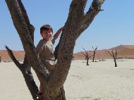 Danach gab es nur noch eines - Vollgas! Ohne auch nur einmal nach links und rechts zu schauen, hielt ich das Lenkrad fest, und wartete auf eine sandfreie Fläche. Nach unendlichen Minuten kamen wir ans Deadvlei. Geschafft! Wir wanderten los, und merkten schnell, das es einfacher ist, auf der Spitze der Düne entlang zu gehen, als von der Seite die Düne zu besteigen. Zunächst war meine Familie nicht begeistert, doch letztendlich schafften wir es alle, auch unser kleiner Jan, auf die höchste Düne. Die Aussicht war der Mühe Wert, und die Rutschpartie nach Unten um so mehr. Auf dem Rückweg verliefen wir uns doch tatsächlich in der Wüste. |