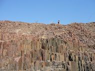 vom Dachbalken aus zusah, machte mich aber doch etwas nervös. Da ich nicht mehr so recht weiter schlafen konnte, bestieg ich eine kleine Anhöhe, um den Sonnenaufgang zu beobachten. Plötzlich folgte mir auch hier ein Hund, ich wieder mal nervös, der Hund aber wohl nur um mein Wohlbefinden bekümmert, bewachte mich auf Schritt und Tritt. Nach dem Frühstück begrüßte uns das Erdmännchen und überredete Jan zu einem Wettbuddeln. Nach dieser Anstrengung brauchten wir noch eine schnelle Abkühlung im Pool. Es war schade dieses Camp schon wieder zu verlassen. Es war insgesamt eines der schönsten Aufenthalte, in einem sehr sauberen, kleineren Camp, welches in keinster Weise kommerziell wirkte. Hier würden wir gerne mal wieder vorbei kommen. Jetzt wollten wir aber erst mal weiter zum versteinerten Wald. Am Parkplatz bekommt man gleich einen Führer zugewiesen. Das Areal ist gut bewacht, da in der Vergangenheit wohl das ein oder andere Stück versteinertes Holz "verschwunden" ist |