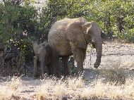 Nein, sieh doch mal da eine Giraffe! Wo, kaum im Park und schon so ein Highlight. Wahnsinn! Mit Begeisterung schauten wir diesen eleganten Tieren zu, und konnten uns kaum lösen. Doch es mußte sein, in der Hoffnung in den nächsten Tagen weitere Tiere zu sehen, fuhren wir weiter. Im Camp selber sollte dann erst mal wieder Jan seinen Spaß haben, der Pool wartete sozusagen schon auf ihn. Danach besuchten wir zum Sonnenuntergang das Wasserloch, wo wieder eine Giraffe wartete. Gibt's denn hier keine anderen Tiere? Wir waren hungrig, warfen also den Grill an und richteten unsere Nachtquartier her. Während wir so die Steaks wendeten, durchschallte ein wildes Geräusch die Dunkelheit. Ich eilte zum Wasserloch und war sprachlos. Bin ich denn hier im Grzimeks Film? Vor mir stand eine riesige Elefantenherde und trötete durch die Nacht, während die Tiere sich gegenseitig mit Wasser und Dreck |