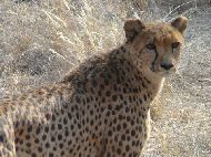 Am nächsten Morgen besuchten wir noch mal den Geparden. Jan hatte seine Kamera vergessen und lief zurück zum Auto, während ich schon mal ein paar Fotos machte. Plötzlich bäumte sich der Gepard auf und jagte mit ungeheurer Geschwindigkeit auf Jan zu. Ich versteinerte und erinnerte mich an den Vortag, als uns der Farmer darauf hinwies, kleine Kinder unbedingt auf den Arm zu nehmen. Heute war zum Glück ein Zaun dazwischen, und es blieb bei dem Schock. Wir fuhren los in den Süden. IWir fuhren auf der gut geschotterten Pad C12 und dann D298 und D601 eine schöne einsame Nebenstrecke. Unter einem Baum mit einem großen Webervogelnest machten wir ein Picknick. Es war der einzige annähernd schattige Platz weit und breit. |
